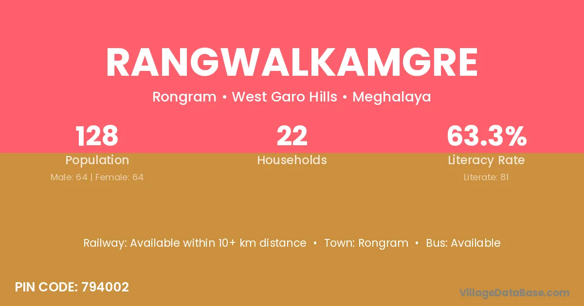 Rangwalkamgre village has a total population of 128 people, of which 64 are males and 64 are females.