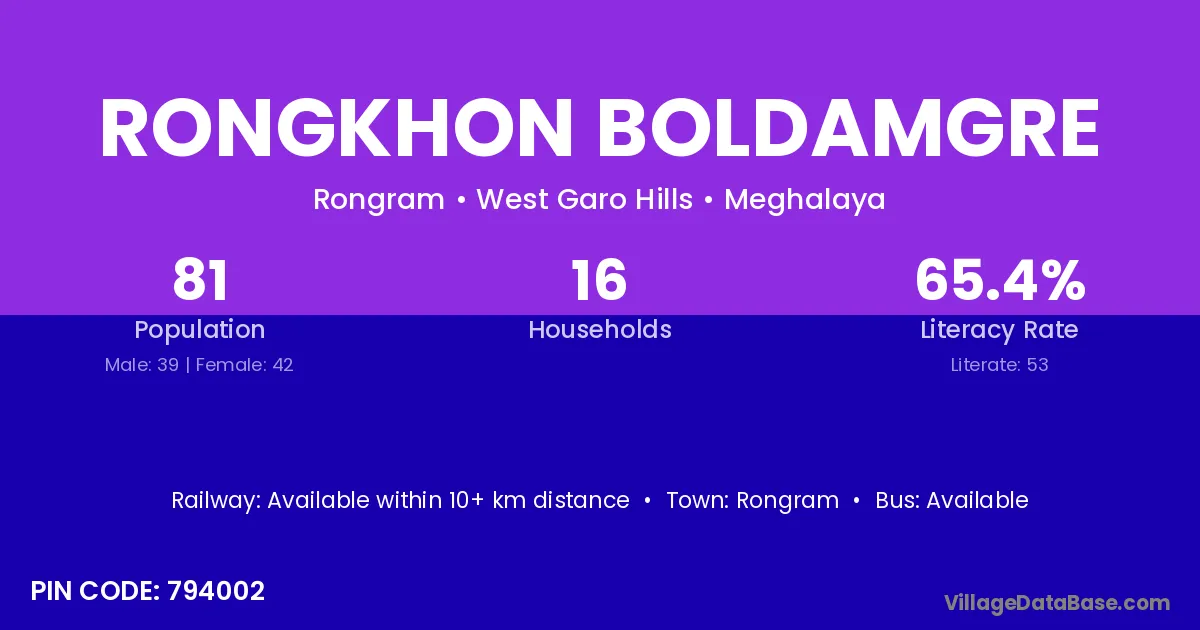 Rongkhon Boldamgre village has a total population of 81 people, of which 39 are males and 42 are females.