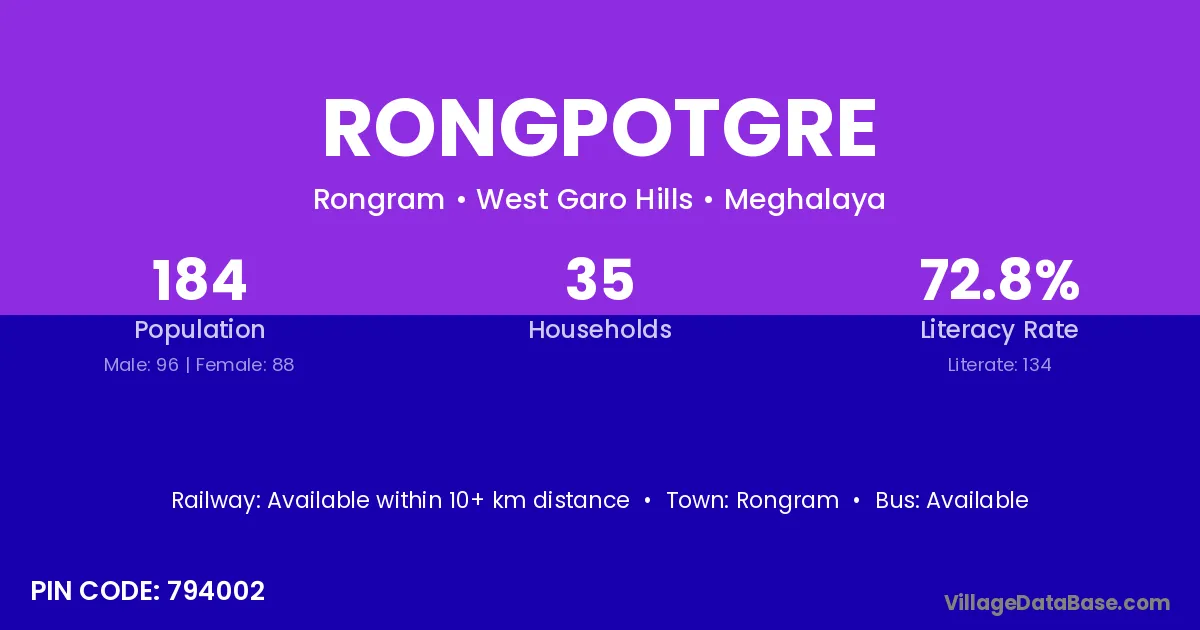 Rongpotgre village has a total population of 184 people, of which 96 are males and 88 are females.