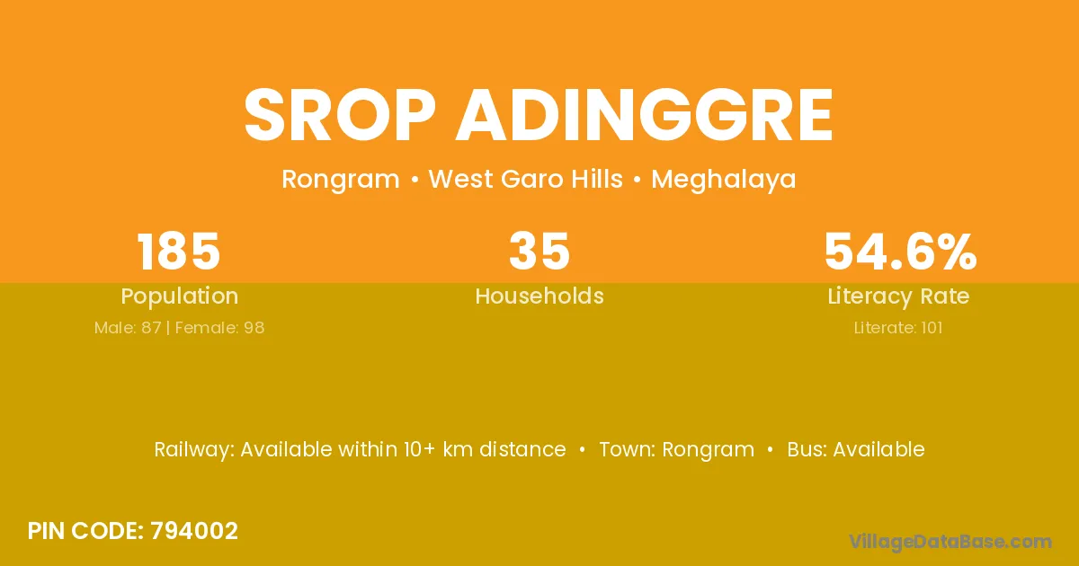 Srop Adinggre village has a total population of 185 people, of which 87 are males and 98 are females.