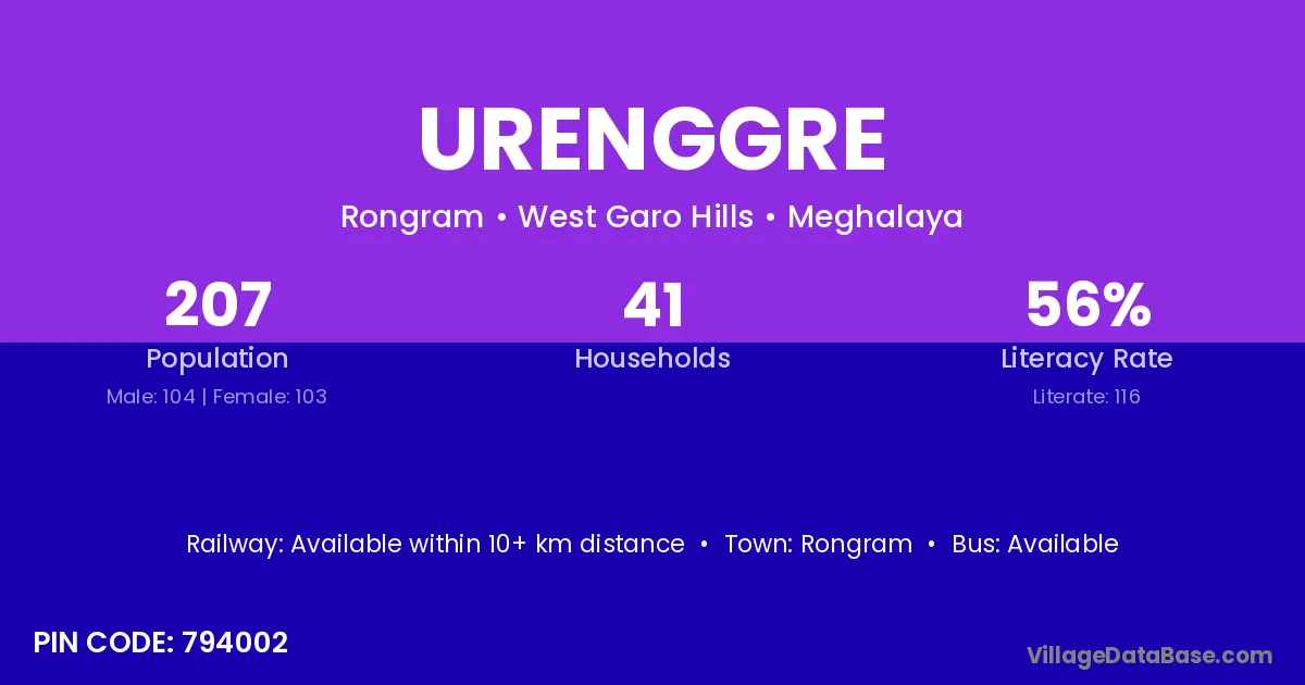 The literacy rate of Urenggre village is 56.04%. Male literacy stands at 57.69% and female literacy at 54.37%.