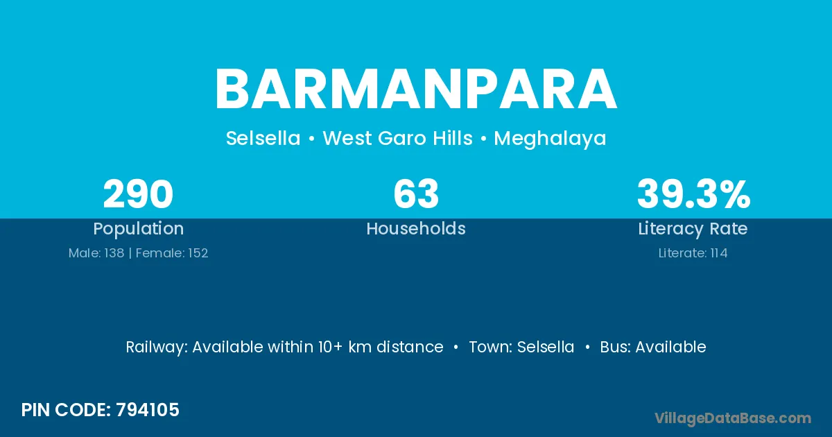 Barmanpara village has a total population of 290 people, of which 138 are males and 152 are females.