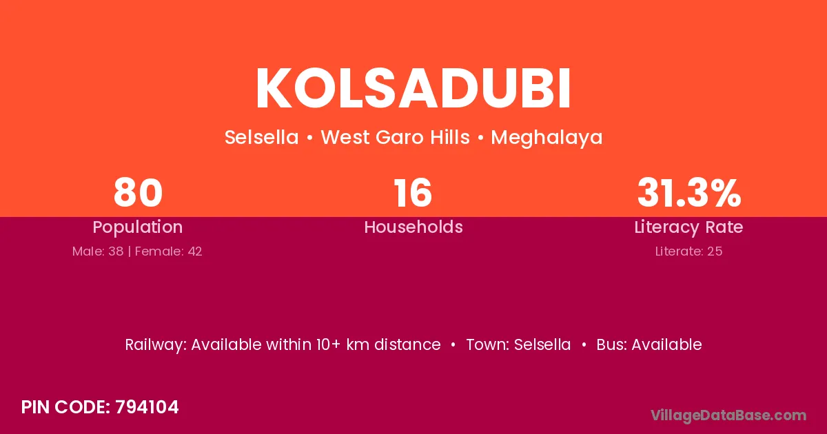 Kolsadubi village has a total population of 80 people, of which 38 are males and 42 are females.