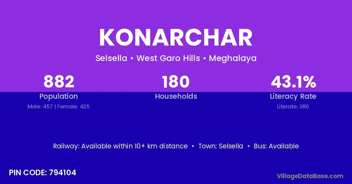 Konarchar village has a total population of 882 people, of which 457 are males and 425 are females.