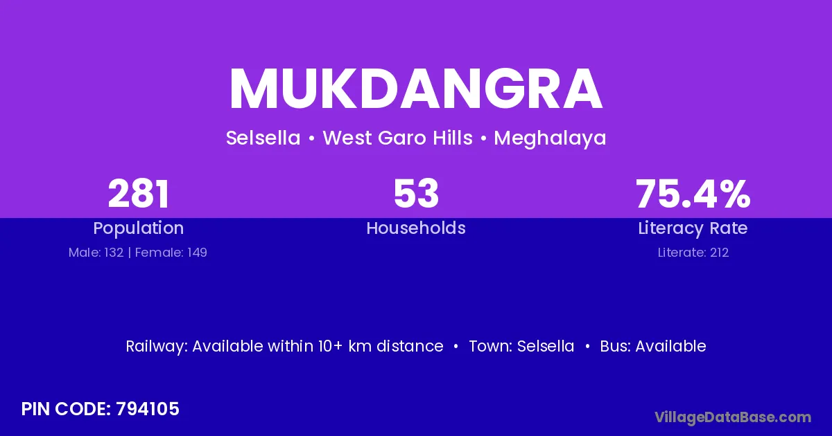 Mukdangra village has a total population of 281 people, of which 132 are males and 149 are females.