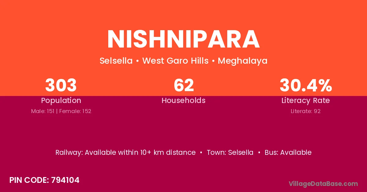 Nishnipara village has a total population of 303 people, of which 151 are males and 152 are females.