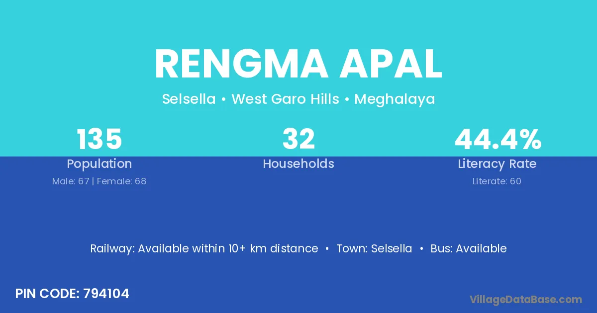Rengma Apal village has a total population of 135 people, of which 67 are males and 68 are females.