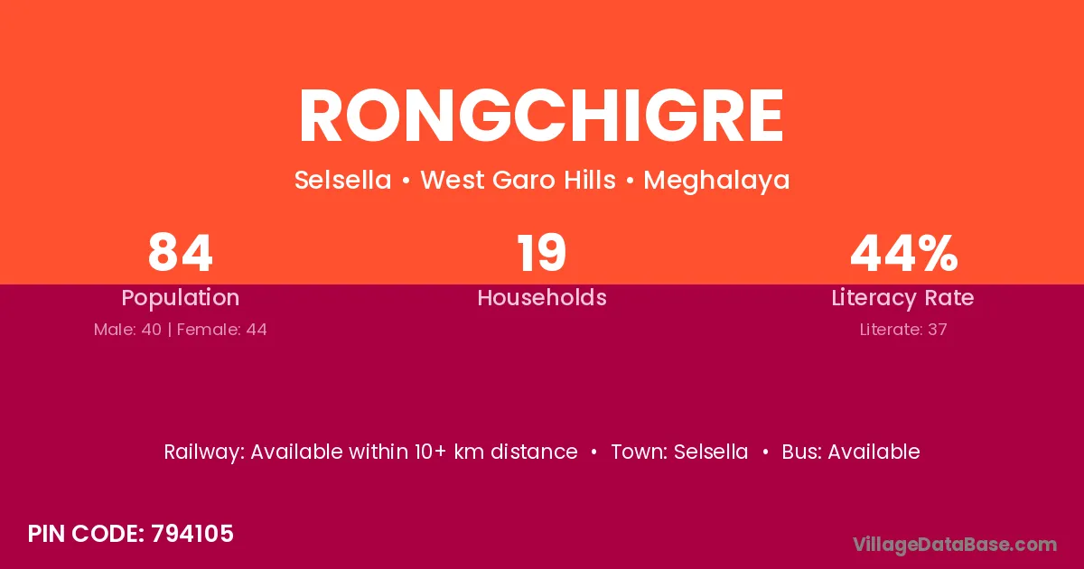 The literacy rate of Rongchigre village is 44.05%. Male literacy stands at 47.50% and female literacy at 40.91%.