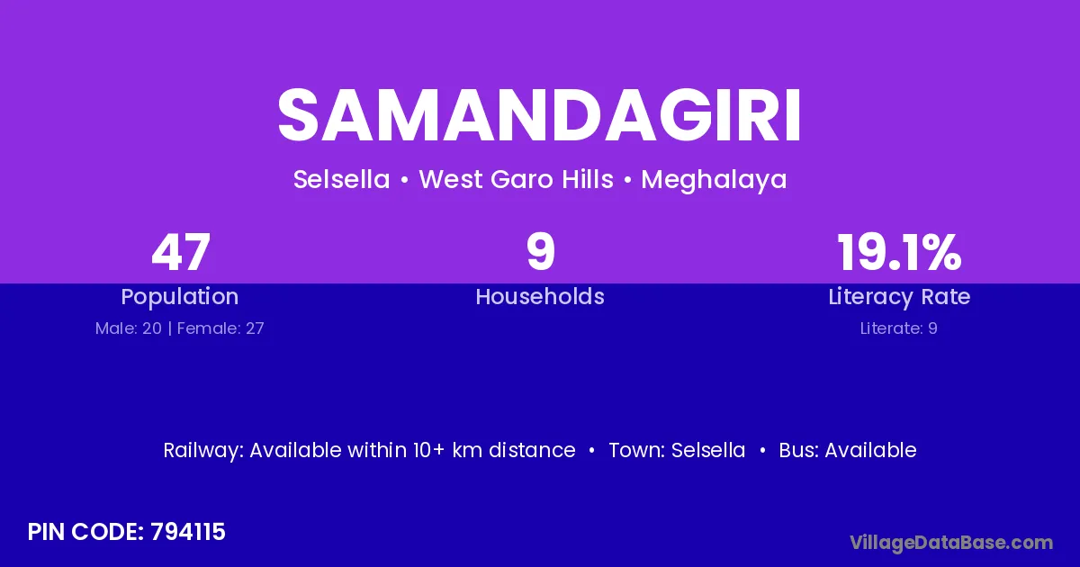 Samandagiri village has a total population of 47 people, of which 20 are males and 27 are females.