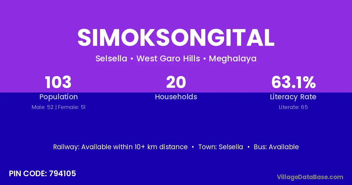 Simoksongital village has a total population of 103 people, of which 52 are males and 51 are females.