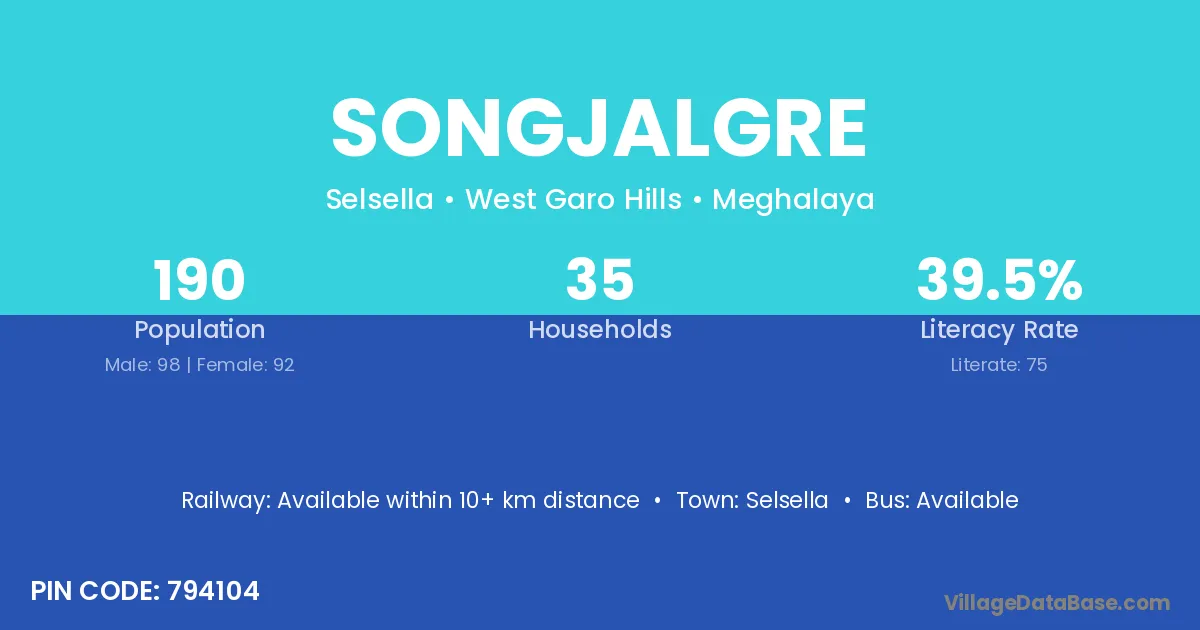 Songjalgre village has a total population of 190 people, of which 98 are males and 92 are females.