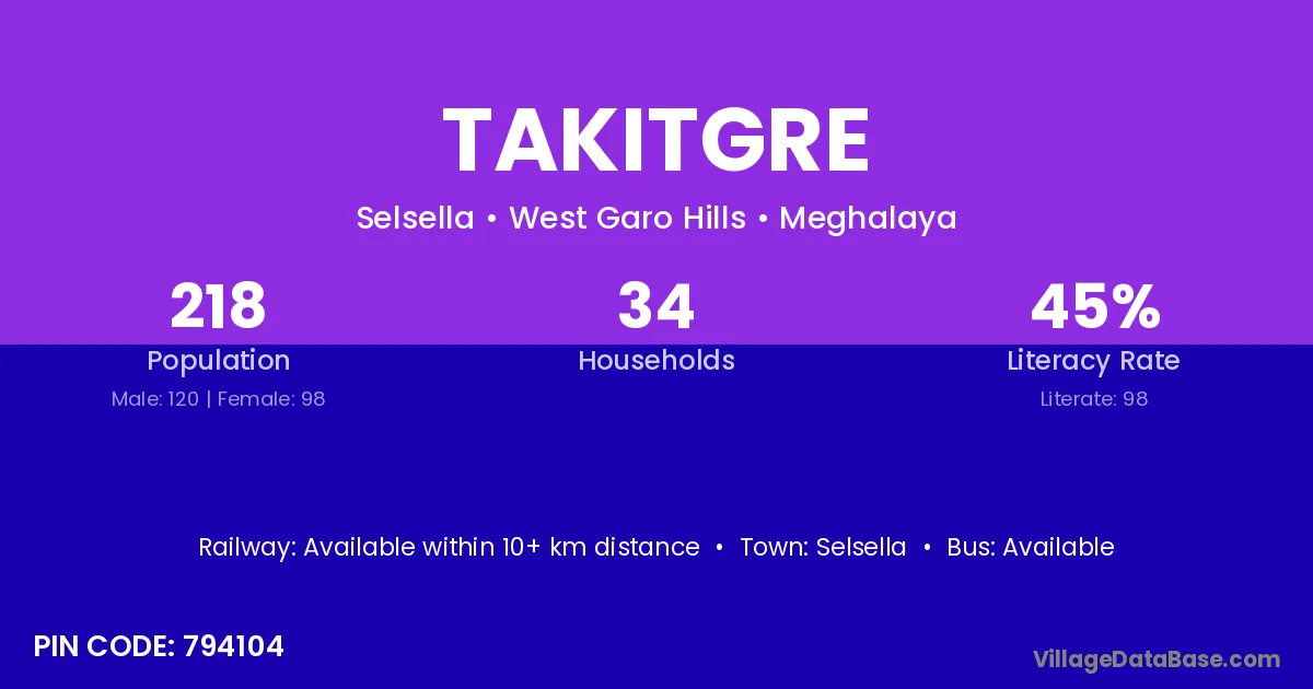 Takitgre village has a total population of 218 people, of which 120 are males and 98 are females.