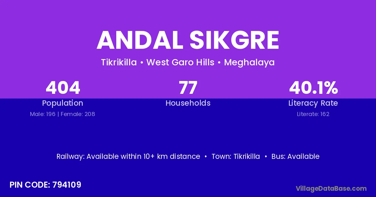 Andal Sikgre village has a total population of 404 people, of which 196 are males and 208 are females.