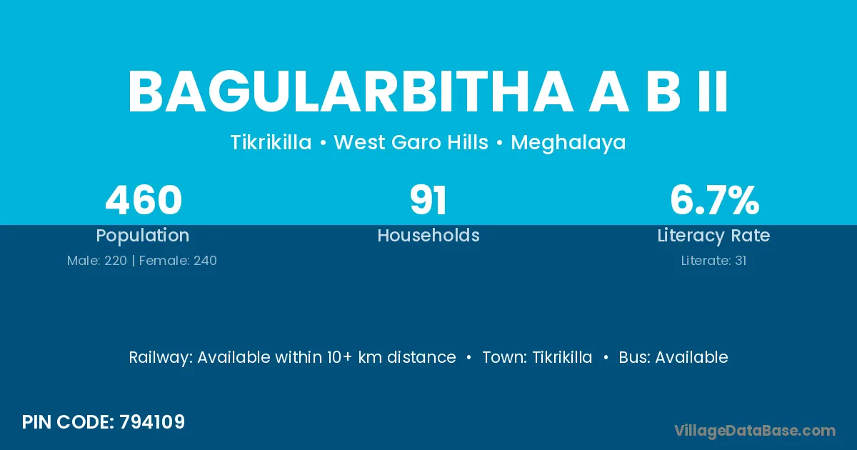 Bagularbitha A B Ii village has a total population of 460 people, of which 220 are males and 240 are females.