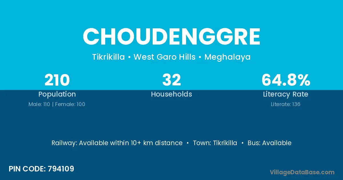 Choudenggre village has a total population of 210 people, of which 110 are males and 100 are females.
