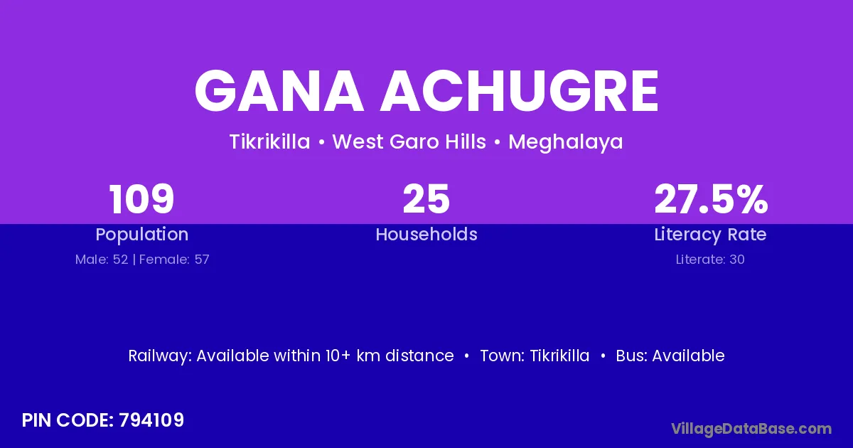 Gana Achugre village has a total population of 109 people, of which 52 are males and 57 are females.