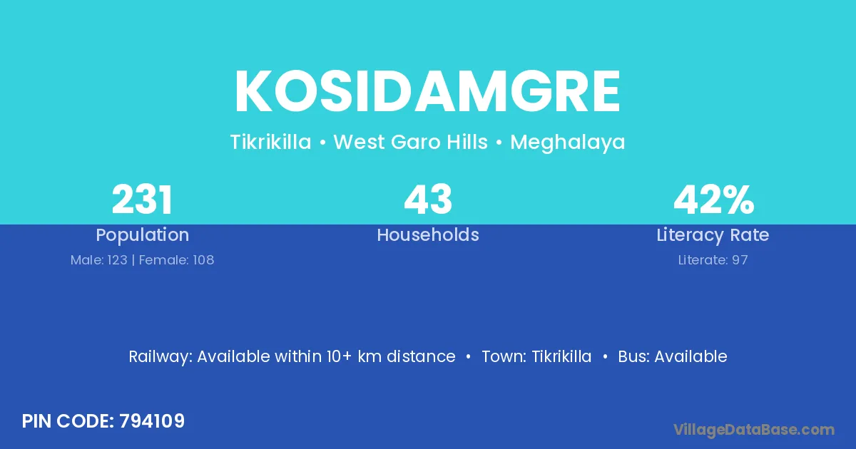 Kosidamgre village has a total population of 231 people, of which 123 are males and 108 are females.