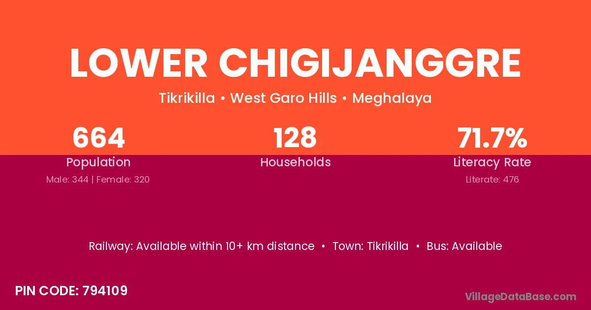 Lower Chigijanggre village has a total population of 664 people, of which 344 are males and 320 are females.