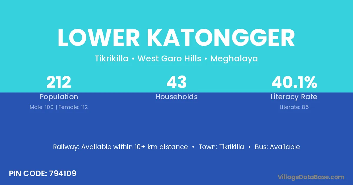 Lower Katongger village has a total population of 212 people, of which 100 are males and 112 are females.