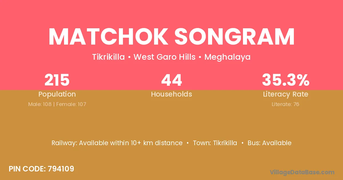 Matchok Songram village has a total population of 215 people, of which 108 are males and 107 are females.