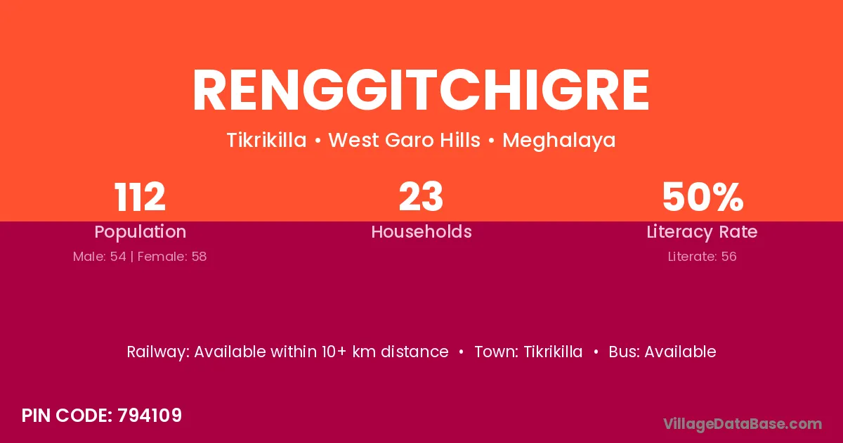 Renggitchigre village has a total population of 112 people, of which 54 are males and 58 are females.