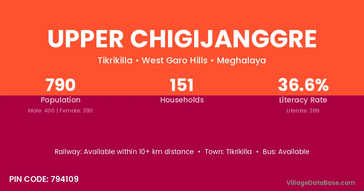 Upper Chigijanggre village has a total population of 790 people, of which 400 are males and 390 are females.