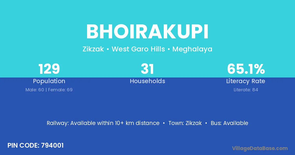 Bhoirakupi village has a total population of 129 people, of which 60 are males and 69 are females.