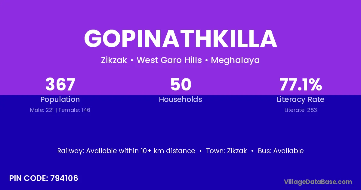 Gopinathkilla village has a total population of 367 people, of which 221 are males and 146 are females.
