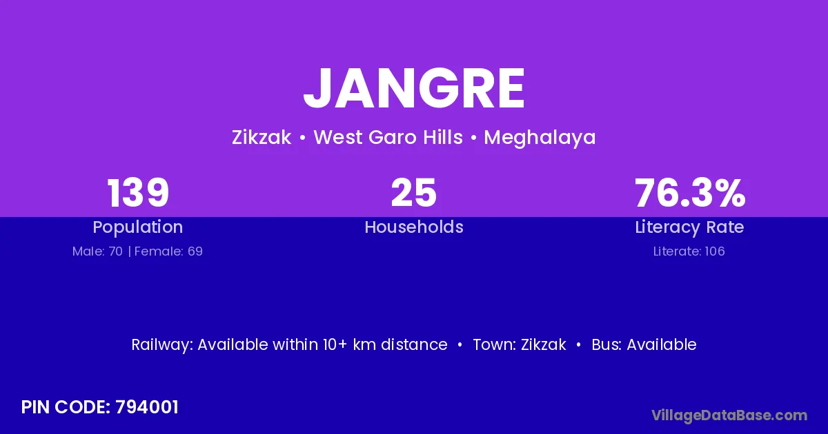 Jangre village has a total population of 139 people, of which 70 are males and 69 are females.