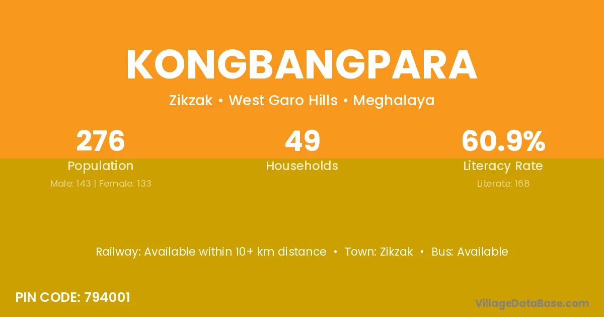 Kongbangpara village has a total population of 276 people, of which 143 are males and 133 are females.