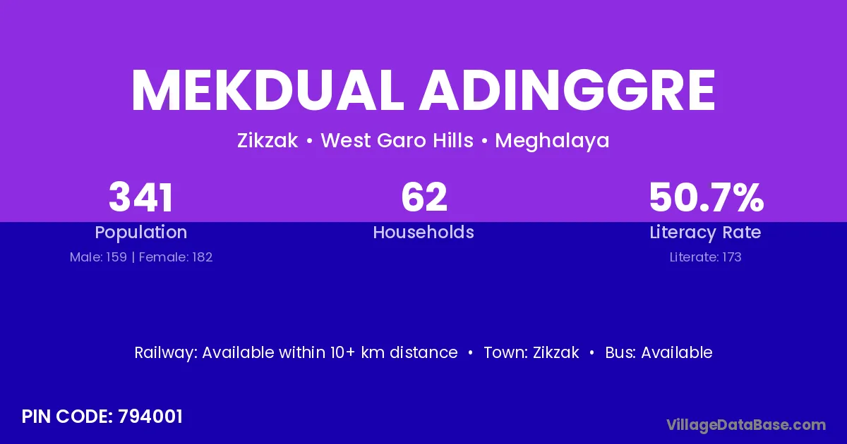 Mekdual Adinggre village has a total population of 341 people, of which 159 are males and 182 are females.
