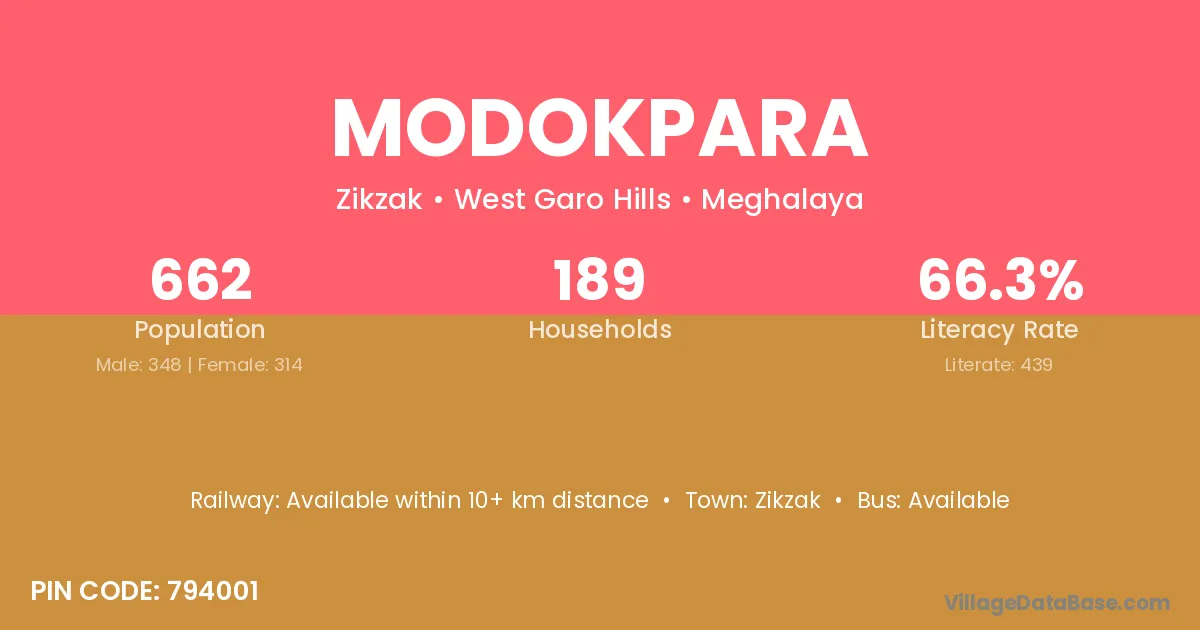 Modokpara village has a total population of 662 people, of which 348 are males and 314 are females.