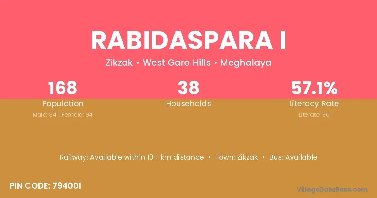 Rabidaspara I village has a total population of 168 people, of which 84 are males and 84 are females.