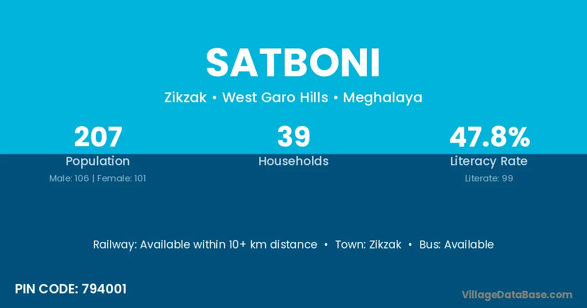 Satboni village has a total population of 207 people, of which 106 are males and 101 are females.
