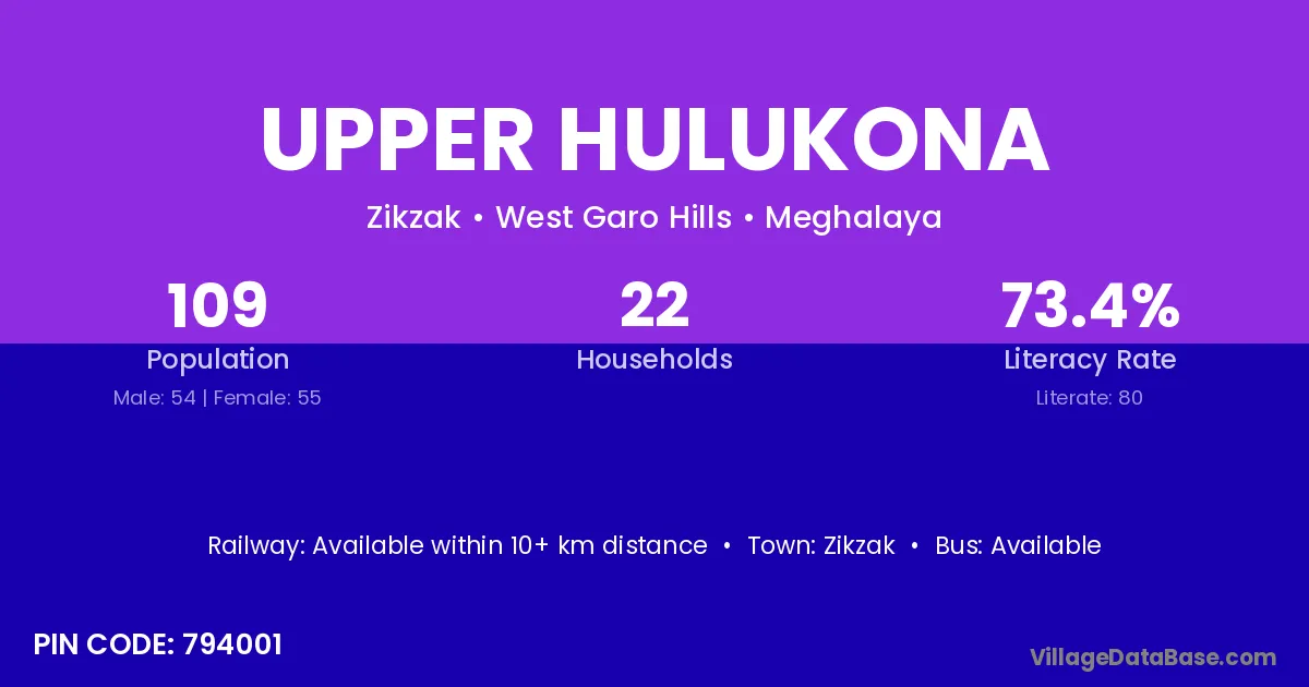 Upper Hulukona village has a total population of 109 people, of which 54 are males and 55 are females.