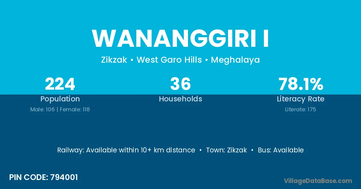 Wananggiri I village has a total population of 224 people, of which 106 are males and 118 are females.