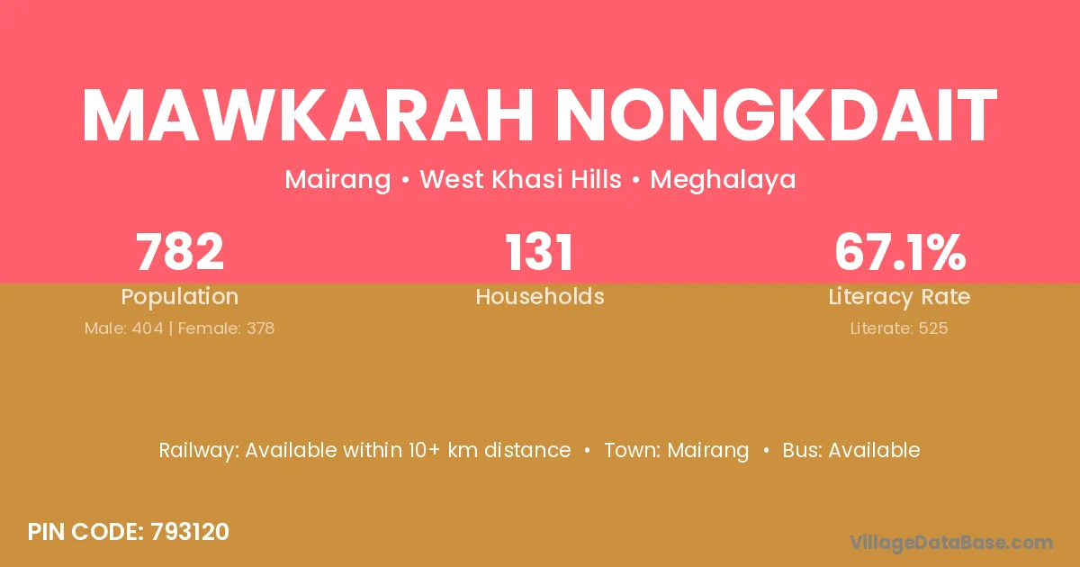 Mawkarah Nongkdait village has a total population of 782 people, of which 404 are males and 378 are females.