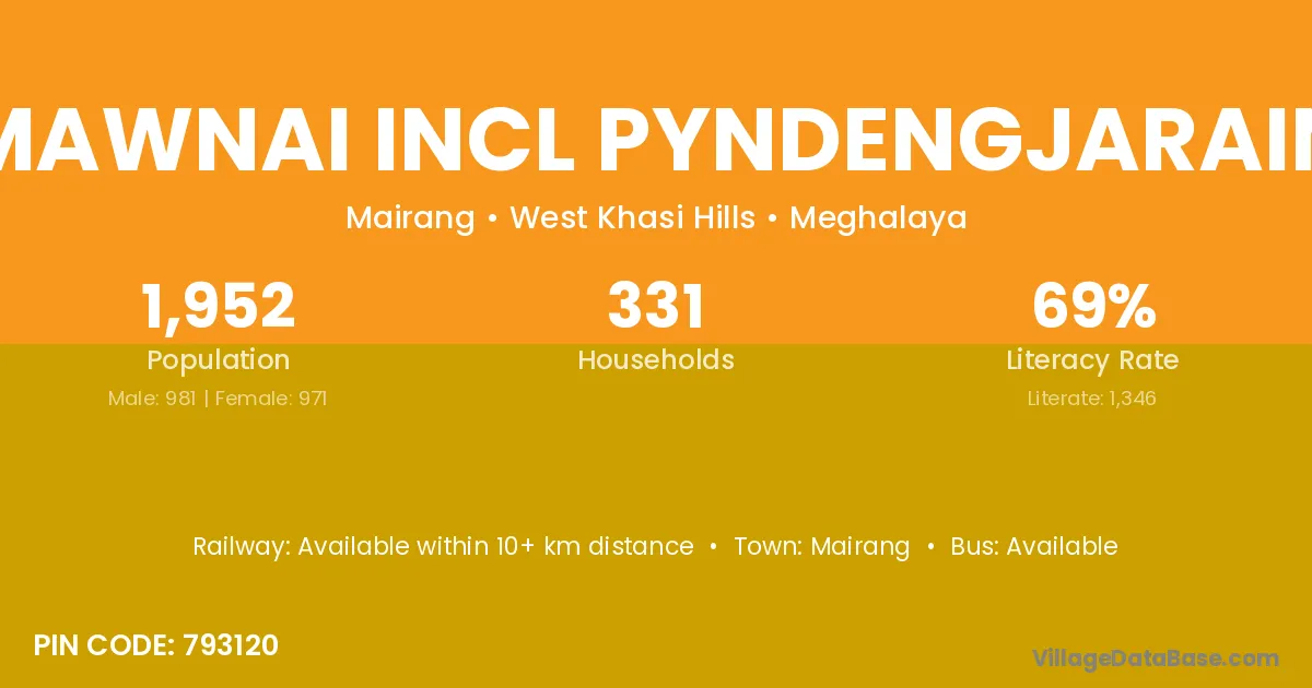 Mawnai Incl Pyndengjarain village has a total population of 1,952 people, of which 981 are males and 971 are females.