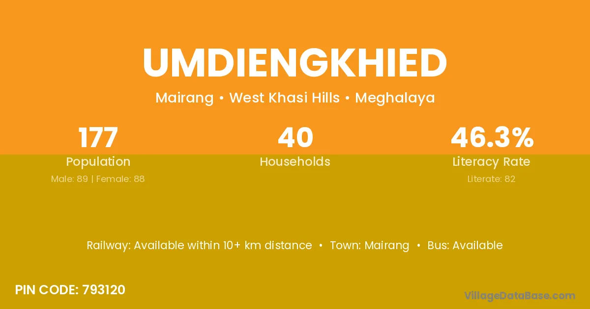Umdiengkhied village has a total population of 177 people, of which 89 are males and 88 are females.