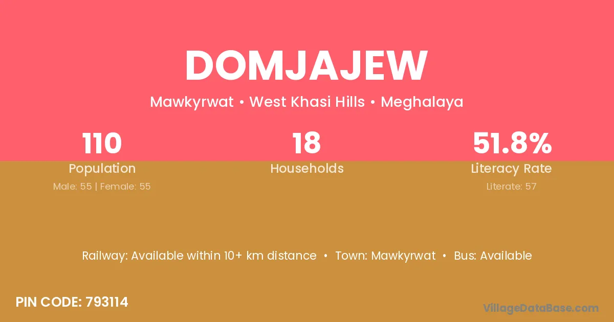 The literacy rate of Domjajew village is 51.82%. Male literacy stands at 52.73% and female literacy at 50.91%.