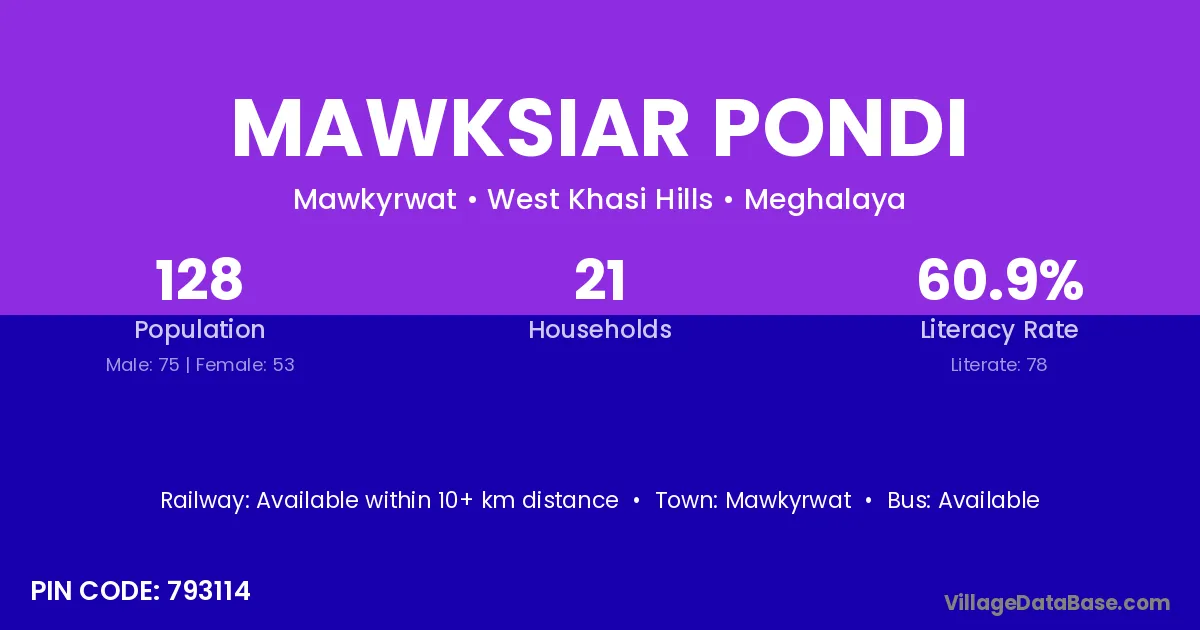 Mawksiar Pondi village has a total population of 128 people, of which 75 are males and 53 are females.