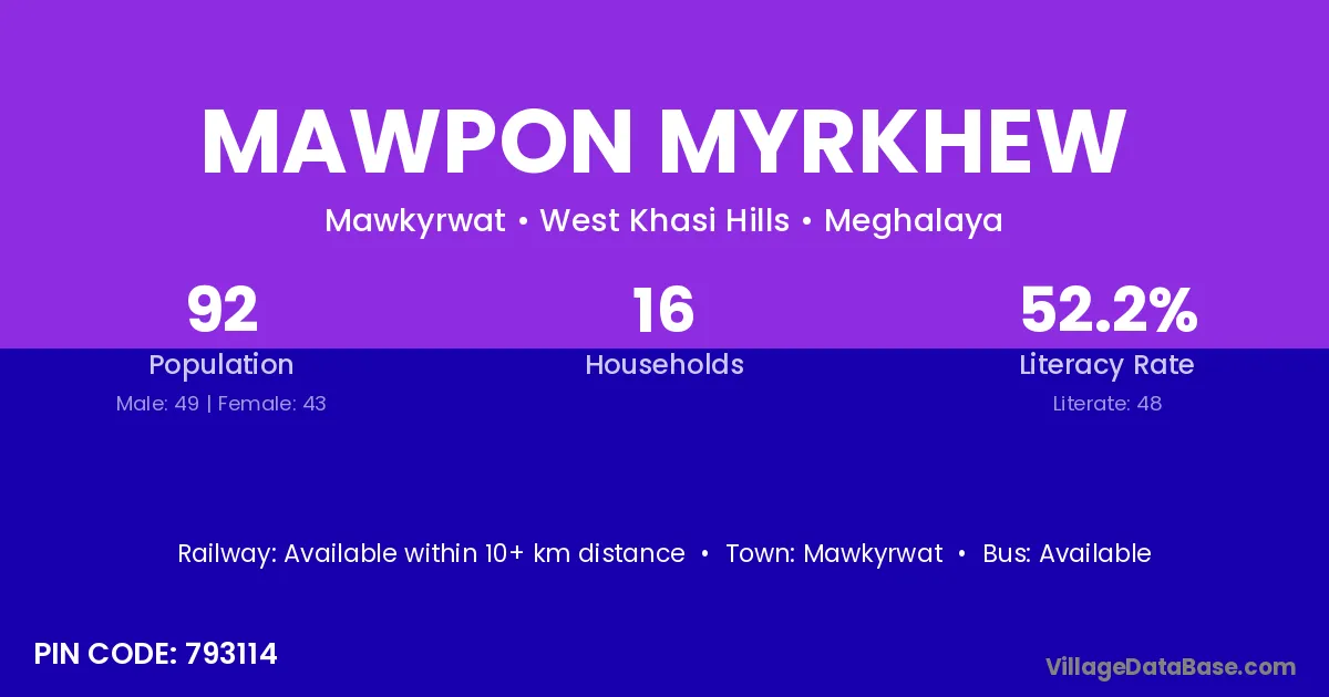 Mawpon Myrkhew village has a total population of 92 people, of which 49 are males and 43 are females.