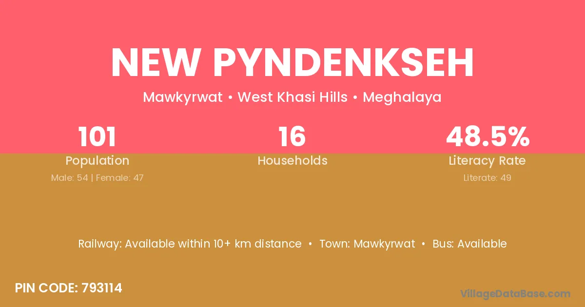 New Pyndenkseh village has a total population of 101 people, of which 54 are males and 47 are females.