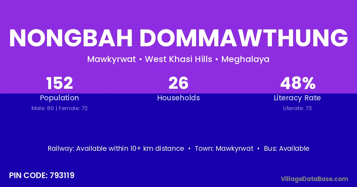 Nongbah Dommawthung village has a total population of 152 people, of which 80 are males and 72 are females.
