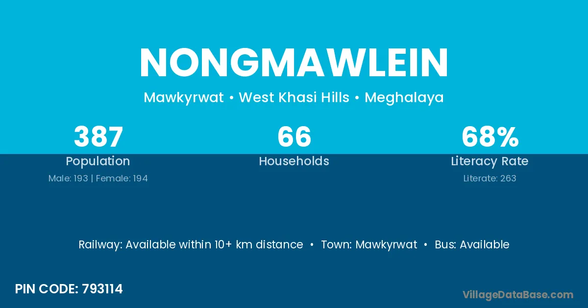 Nongmawlein village has a total population of 387 people, of which 193 are males and 194 are females.