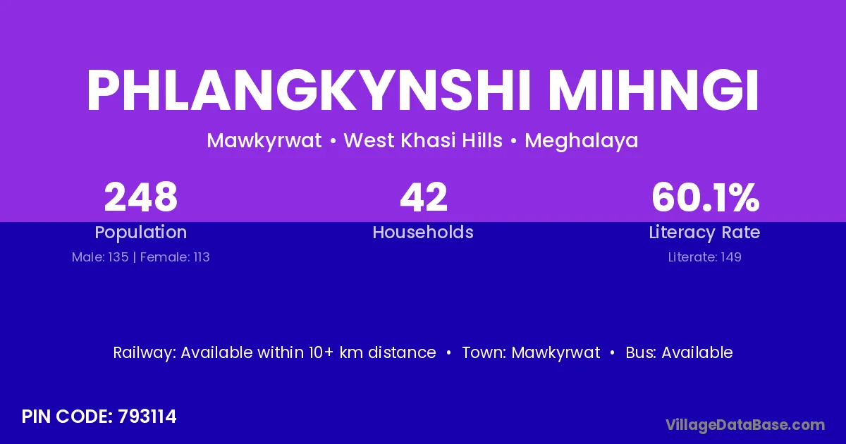Phlangkynshi Mihngi village has a total population of 248 people, of which 135 are males and 113 are females.