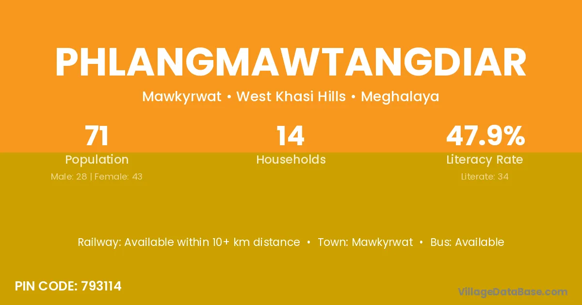 The literacy rate of Phlangmawtangdiar village is 47.89%. Male literacy stands at 39.29% and female literacy at 53.49%.