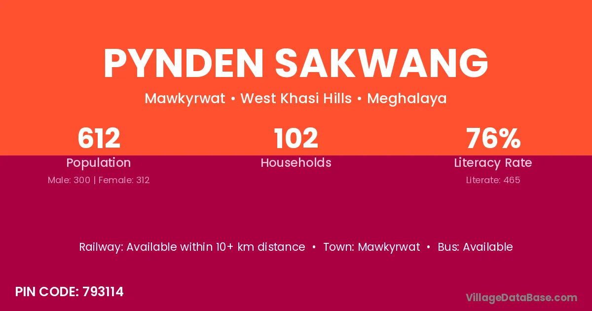 Pynden Sakwang village has a total population of 612 people, of which 300 are males and 312 are females.
