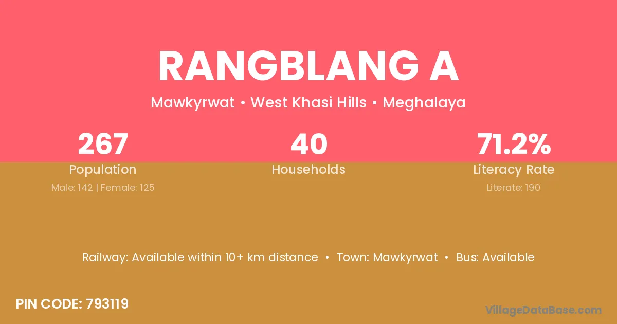 Rangblang A village has a total population of 267 people, of which 142 are males and 125 are females.