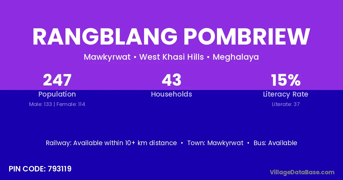 Rangblang Pombriew village has a total population of 247 people, of which 133 are males and 114 are females.